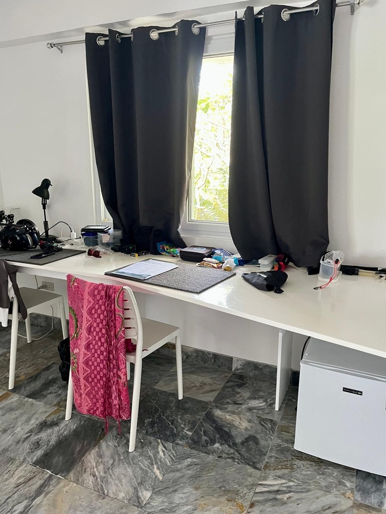 Ein Traum für alle Fotografen: Es gibt einen großen Arbeitstisch mit ausreichender Beleuchtung und vielen Steckdosen. Zwei komplette Fotoausrüstungen samt aller Ladestationen finden leicht Platz. Auf der Terrasse ist ausreichend Platz. Sie ist mit einem Tisch und zwei Stühlen bestückt. Wenn man sich hier noch etwas wünschen könnte, wäre es eine Liege zum Relaxen zwischen den Tauchgängen.